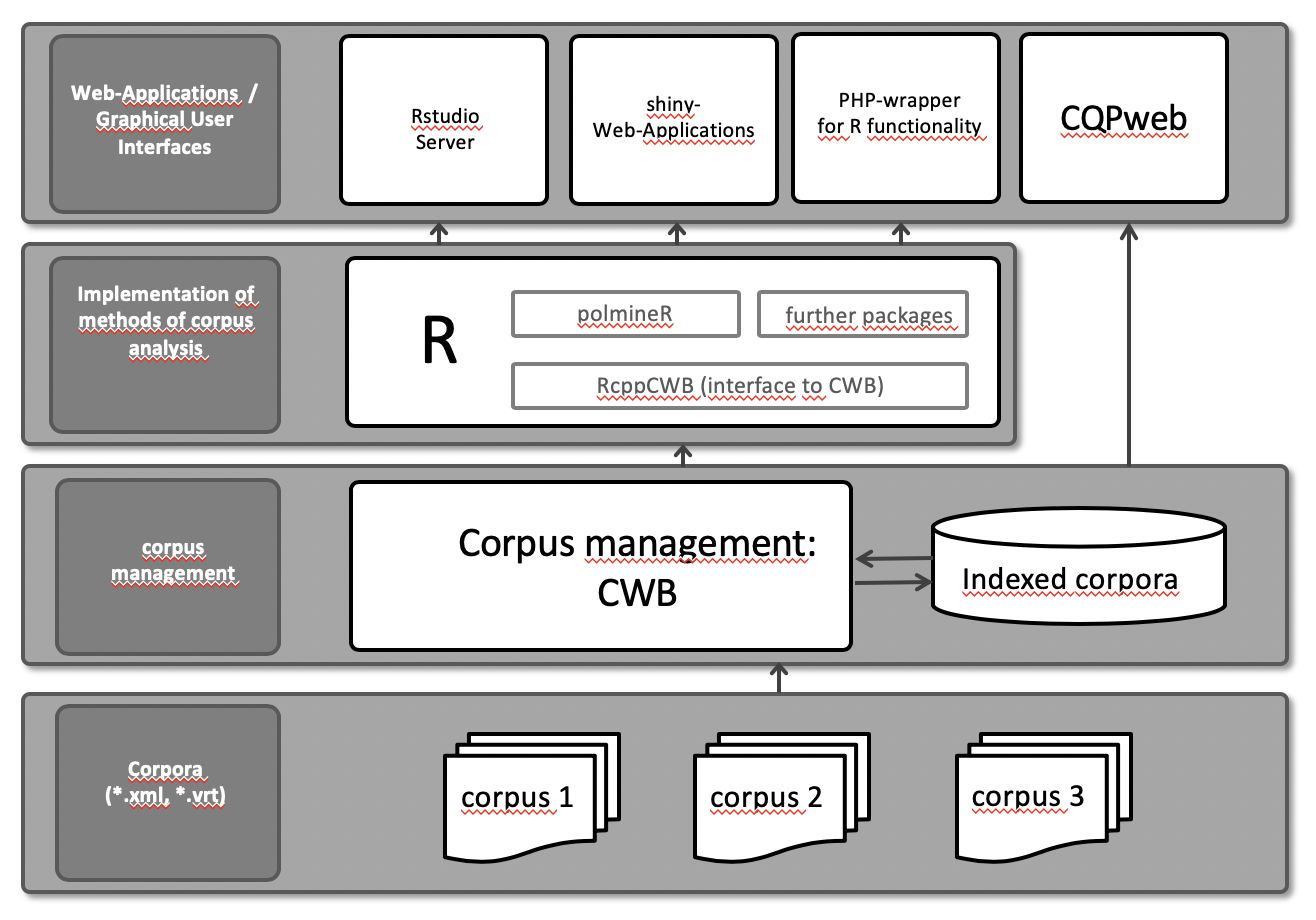 class: center, middle, inverse, title-slide # Quanlify with ease: Combining quantitative and qualitative corpus analysis ### Andreas Blaette ### SSHOC Webinar | April 16, 2020 --- # Corpus analysis: An emerging field. ## What are the challenges? -- There is no lack ... - of algorithms - of ideas and projects on research data management (implementing FAIR data principles) But ... -- * Acquisition of NLP techniques in the social sciences & humanities still piecemeal -- * Tools for processing text that scale well are just emerging -- * Availability of data for replication is missing -- * Reproducibility of data (getting FAIRER) is wanting -- * Integration of quantitative and qualitative approaches to text is technically difficulat --- # The PolMine Project (www.polmine.de) ## Research - Data - Code - Tutorials - Centre -- ### Corpora - **GermaParl**: Corpus of the German Bundestag, regional parliaments  - **UNGA** Verbatim Records of the United Nations General Assembly  - **MigParl**: Debates on migration and integration in Germany's Regional Parliaments - **MigPress**: Corpus of reports on migration and integration in Süddeutsche Zeitung und Frankfurter Allgemeine Zeitung (2000-2019) -- *(Toolchain for corpus preparation: **frapp**, **bignlp**, **biglda**, **trickypdf**)* -- ### Packages for corpus analysis - **polmineR**: Elementary vocabulary for corpus analysis  - **RcppCWB**: R Wrapper for the C Code of the Corpus Workbench (using C++/Rcpp)  - **cwbtools**: Tools to create and manage CWB indexed corpora  --- # Things are evolving. ## But where do we stand? -- * Acquisition of NLP techniques in the social sciences & humanities:<br/> _Working with large-scale, linguistically annotated corpora_ -- * Tools for processing text that scale well are just emerging:<br/> _Packages such as bignlp, biglda_ -- * Availability of data for replication is missing:<br/> _Depositing data with Zenodo (or other open science repositories)_ -- * Reproducibility of data (getting FAIRER):<br/> _100% reproducibility of data_ -- * <span style="background-color:yellow">Integration of quantitative and qualitative approaches to text is an unfulfilled promise</span> --- # Assumption, Problem, Vision and Plan **Assumption:** The validity of our research with large-scale corpora depends on our ability to combine the quantitative and the qualitative analysis of textual data. -- **Problem:** It takes a software engineer to implement an integrated environment for the quantitative and qualitative analysis of text. You need funding to entertain the cooperation with a software engineer. Funding ends. Solutions are not sustainable. -- **Vision:** Wouldn't it be great to have an open source, modular toolset that can flexibly be used by ordinary computational social scientists to implement "quanlitative" workflows? -- **Plan of this Talk** 1. Theory is Code - The "Quanlification" Frontier 2. Quanlification as a Matter of Design 3. Implementing Quanlifictation 4. Work Ahead - Getting Things Done 5. Discussion ??? We do not want to get rid of the collaboration with the guys from computer science. But interdisciplinary constellations should be based on a demand of what they find interesting. Usually, that's not writing GUIs for other people. --- background-image: url(img/Le_Penseur_min.jpg) background-size: cover class: nobackground, inverse .attribution[Photo: [Daniel Stockman](https://www.flickr.com/photos/84989911@N00/4694248310)] # Theory is Code ## The "Quanlification" Frontier --- # From text to numbers ## The idea of "distant reading" - "[…] the trouble with close reading […] is that it necessarily depends on an extremely small canon. […] what we really need is a little pact with the devil: we know how to read texts, so now let‘s learn how not to read them. Distant reading, where distance, let me repeat is, is a condition of knowledge. It allows you to focus on units that are much smaller or much larger than the text: devices, themes, types – or genres and systems. And if, between the very small and the very large, the text itself disappears, well, this is one of the cases where one can justifiably say, Less is more.“ (Moretti [2000] 2013: 49) -- ## The "text as data" movement: - scaling party positions (wordscore and wordfish) as a driver -"[…] while our method is designed to analyse the content of a text, it is not necessary for an analyst using the technique to understand, or even read, the texts to which the technique is applied. " (Laver, Benoit & Garry 2003) --- # Text + Numbers = Quanlification ## An obsolete methodological divide? -- .pull-left[ ### Quantity - Text as Data - Natural Language Processing (NLP) - Data / Text Mining - Machine Learning (ML) - "Validate, validate, validate" (Grimmer et al. 2013) ] -- .pull-right[ ### Quality - eHumanities / Digital Humanities - Corpus Linguistics - Computational Linguistics - "blended reading" (Stulpe, Lemke 2015), "scalable reading" (Weitin 2017) & related concepts ] -- ### Quanlification - Epistemological disputes notwithstanding: The necessity to combine qualitative and quantitative approaches to text is conceptually undisputed. - Software inhibits combining quantity and quality: Tools are there, but setting up a quanlitative project is expensive: Difficult without a dedicated software engineer --- background-image: url(img/clipart1299822.png) background-size: cover class: nobackground, inverse .attribution[[www.clipartmax.com](https://www.clipartmax.com/middle/m2i8N4N4K9m2H7b1_room-and-pillar-mining-room-and-pillar-mining/)] # A Matter of Design ## Data Structures Matter --- # Three-Tier Architecture: C & R & More  --- # Verbs and nouns for corpus analysis ## polmineR: A basic vocabulary for quanlification - __Corpora and subcorpora__ - corpus objects: *corpus()* - subsetting corpora: *partition()* / *subset()* -- - __Quantification__ - counting: *hits()*, *count()*, *dispersion()* (and *size()*) - cooccurrences: *cooccuurrences()*, *Cooccurrences()* -